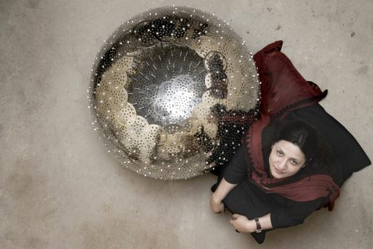 She experiments with found objects such as metal strainers used in drainage in bathrooms, and common objects such a car mufflers and gear shifts and their meaning in triggering memories or stimulating our imaginations. Her approach is to decontextualize, to remove an object from its mundane classification and replace it with a new identity. The artist uses unusual materials that depict serious themes such as safety, terrorism, death, destruction, confinement, and women’s empowerment are at times imbued with comic elements. Working with ceramic, steel sheets, pipe fittings, relief, and freestanding forms, she comments on the evolution of her work: “It has been a natural evolution for me. My college projects used to be about found objects, where I once made a tea fountain in a shrine. I then worked with motorcycles. The presence of utensils in my work came from using gadgets that made the life of women easier. So, I was making these objects my own. Now, I am using the skin of these objects to make the artwork. There is a loss of humor compared to earlier works because I am talking more of death in this suite of works.” Her art—often characterized by beautiful surfaces and intricate details—has been exhibited in Lahore, New York, London, Milan, and Karachi.