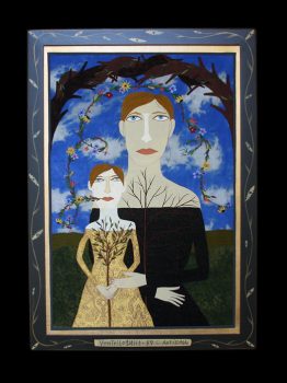 Self-taught fiber artist Chris Roberts-Antieau explores the “mysterious origin of joy and the wonder of childhood” in her fabric paintings—tapestries composed of fabric applique and intricate embroidery done on a sewing machine. “My art is really a by-product of my life and what I believe about being alive,” she says. “I seem to be cursed with a constant vision of the ‘big picture’ part of life, which constantly brings forth the same truths—that we are all blessed with the ability to recognize and create joy, and that life is about that creation.”