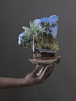 The Nigerian-born multimedia artist Otobong Nkanga currently works in Amsterdam and Paris, where she explores questions relating to her native country. Nkanga is particularly interested in memory and how that relates to place. In Shaping Memory, she depicts a traditional Nigerian hut with a lush landscape behind it. The fact that the work has been cut out from its surroundings and decontextualized atop an anonymous hand commodifies the scene. The hut ceases to be a simple image of a place; it instead becomes something fragile, capable of being exploited. The fact that there are two versions of this image—one in color, one in black and white—strengthens that quality.