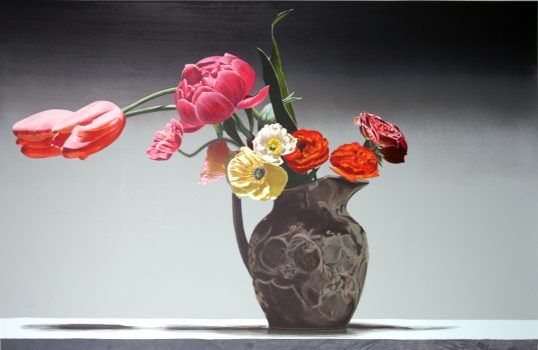 Ben Schonzeit paints magically evocative pictures with a Surrealist edge. A pioneer in the SoHo art scene of the 1960s and one of the leaders of the Photorealist movement of the 1970s, he is best known for his gorgeous still lifes of flowers – large, arresting canvases that explore the artist’s dream world. Schonzeit has had numerous one-man exhibitions, and his work can be found in the permanent collections of major museums around the world. In addition to paintings, our shows reveal the artist’s lifelong interest in works on paper, drawings and water colors.