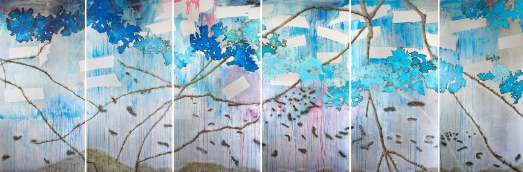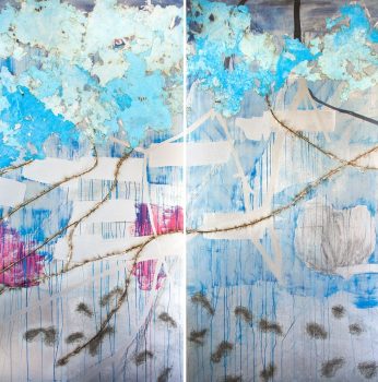 Lehr has been described as a visual poet. She uses nature based images to explore the possibilities of painterly experiments. The subtle color harmonies combined with veils of Japanese paper contrast with the expressionistic splashes, drips, and fluidity of the grounds. The tensions balanced between the abstract and the illusion, the hidden and the revealed, the hard edged and the soft focus all add to the mystery and the resonance of the work.