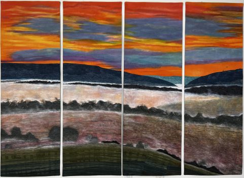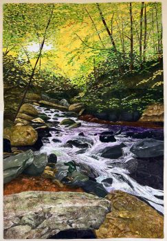 Nancy Hershberger is a fiber artist and instructor who creates quilts inspired by the dairy farms, cornfields, streams, and forests of her home in rural southern Pennsylvania. While Hershberger began her practice employing the traditional quilting method of piecing fabric scraps, she later transitioned to experimenting with different techniques and tools to capture the light, texture, and color effects of the outdoors. In addition to the landscape of Pennsylvania, Hershberger frequently portrays scenes of U.S. National Parks.