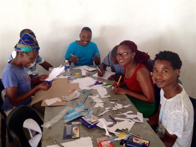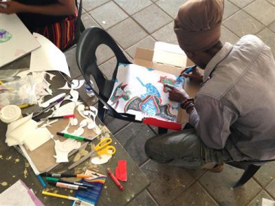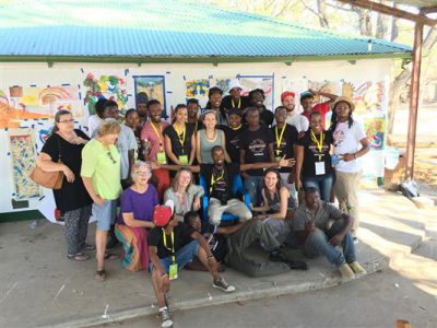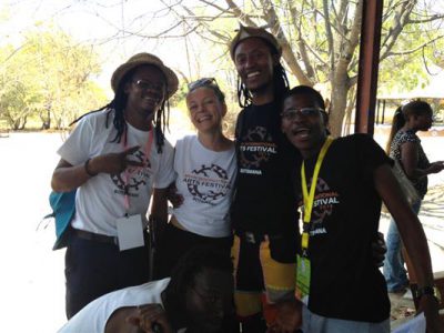 After having spent five days in Gaborone, where the exchange concluded with a reception at the Ambassadors’ Residence for all participants in the workshop at the Thapong Visual Arts Centre, and the creation of a mural with Clouse and Gleisner, the three artists traveled to Maun to conduct a series of workshops at different venues, including the Nhabe Museum. The participants in our Maun workshop were a diverse group of performance artists, musicians, poets, and visual artists. The atmosphere at the festival in Maun was collaborative, experimental and supportive. The whole village became an audience for events taking place at venues all across the town. Many schools from all over Botswana brought students and their parents to attend.