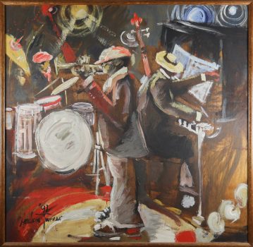 Andrew Turner chronicled the joys and pathos of ordinary people. Blending the drama of seventeenth-century Dutch painting with impressionist brushwork, Turner derived his subject matter from jazz and his daily experiences within the neighborhoods of Chester and Philadelphia, Pennsylvania. “I tend to measure the success of my pieces by how they stand up technically, emotionally, and innovatively to a Coltrane solo or whether I’ve captured the spirit of the occasion, a la Ellington…At the very least, hopefully, these vignettes of experience will help to provide insight into some African American lifestyles and serve as an inspiration to my students and others to continue the legacy of African American participation in the arts,” he said.