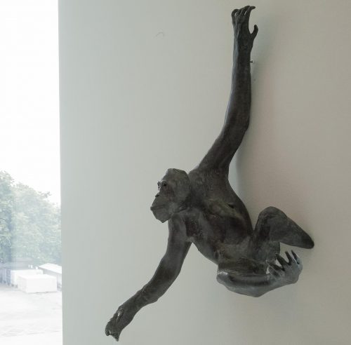 Daisy Youngblood is a sculptor whose figurative forms in clay and cast bronze convey intense emotional complexity. Employing traditional hand-modeling techniques, Youngblood constructs sculptures of animals, humans, and haunting hybrids of the two; among her subjects are hulking gorillas, mournful elephants, horses, goats, and fantastical hawk-women. Rather than distancing themselves as exotic, threatening beasts, Youngblood’s figures evoke a sense of vulnerability, with bodies bent, twisted, and fragmented. She further humanizes these assorted creatures by giving them an inhabitable quality; their eyeless faces and hollow bodies inspire a reaction of empathy, drawing the viewer’s gaze inward into an empty space beyond their fragile shells. Her chosen material of the earth itself imbues her work with ancient, archetypal attributes and bears a symbolic relationship to the various mythological traditions her imagery calls to mind. Through their rough contours, scarred surfaces, and pared-down forms, Youngblood’s pieces invite comparisons to both prehistoric cave painting and abstract expressionism, bringing about an unexpected convergence of two dramatically disparate periods of art history. With her aptitude for molding psychological vitality into lifeless clay, Youngblood creates striking contemporary sculptures with immediate, visceral, and enduring impact.