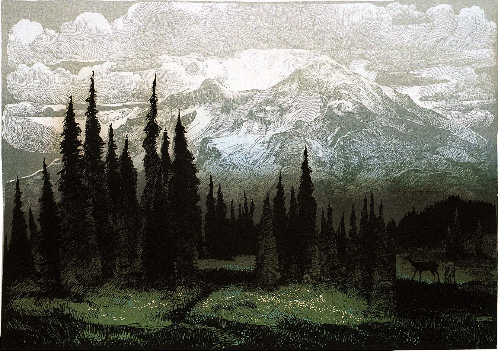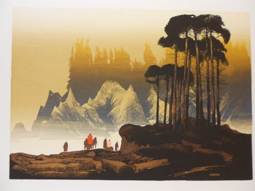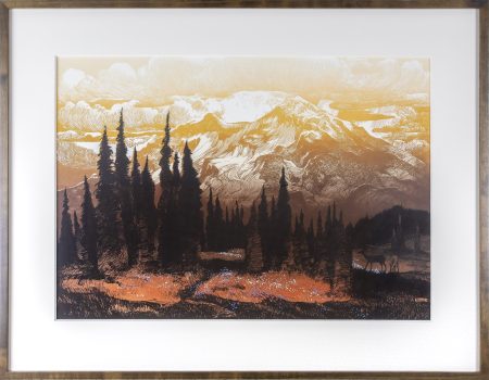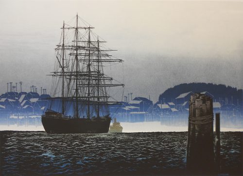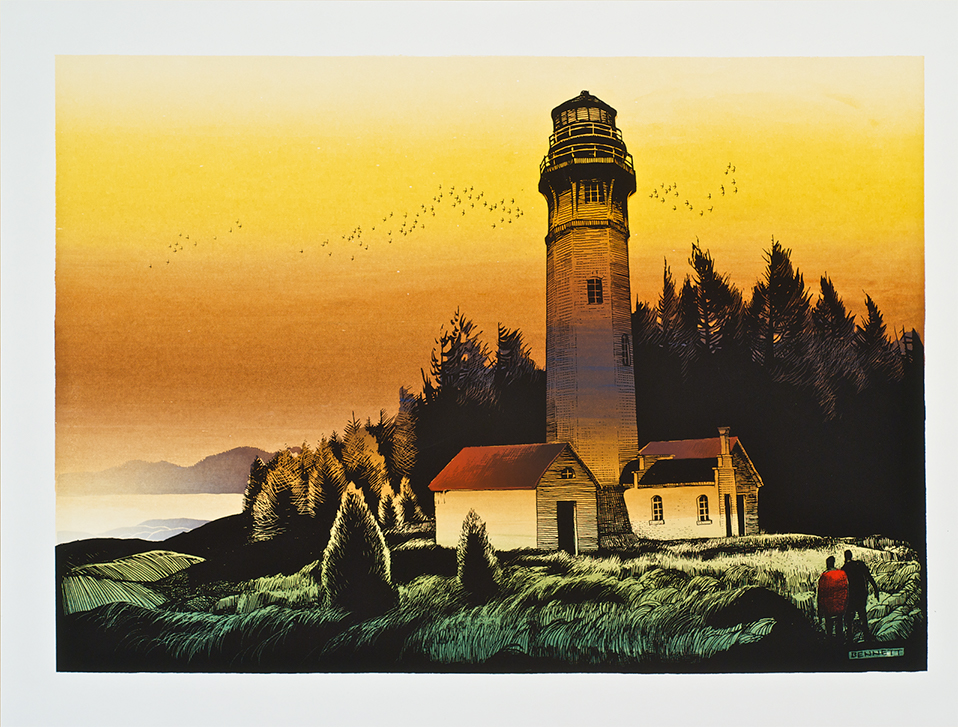 Elton Bennett’s silkscreens center around nature hikes with family and friends in the Pacific Northwest and coastal scenes from his childhood featuring tall ships, steamships, and old lumber mills. Bennett created over 100 serigraph designs from one screen, and made his art accessible and inexpensive, never selling his prints for more than fifteen dollars. Bennett said of his work, “I want [it] to become you. I want the person looking at my artwork to feel so much a part of it that the figure becomes them in that scene.”