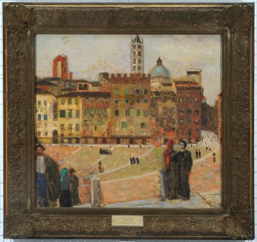 Painter Eugène Vail was celebrated for his impressionistic village and winter sports scenes. The artist utilized vigorous brushwork and uniform, short rectangular strokes to augment the motion within his images. Initially painting in the tradition of the academic French Salon, Vail shifted to a looser and freer approach and lightened his palette after observing the autumn colors in Venice.