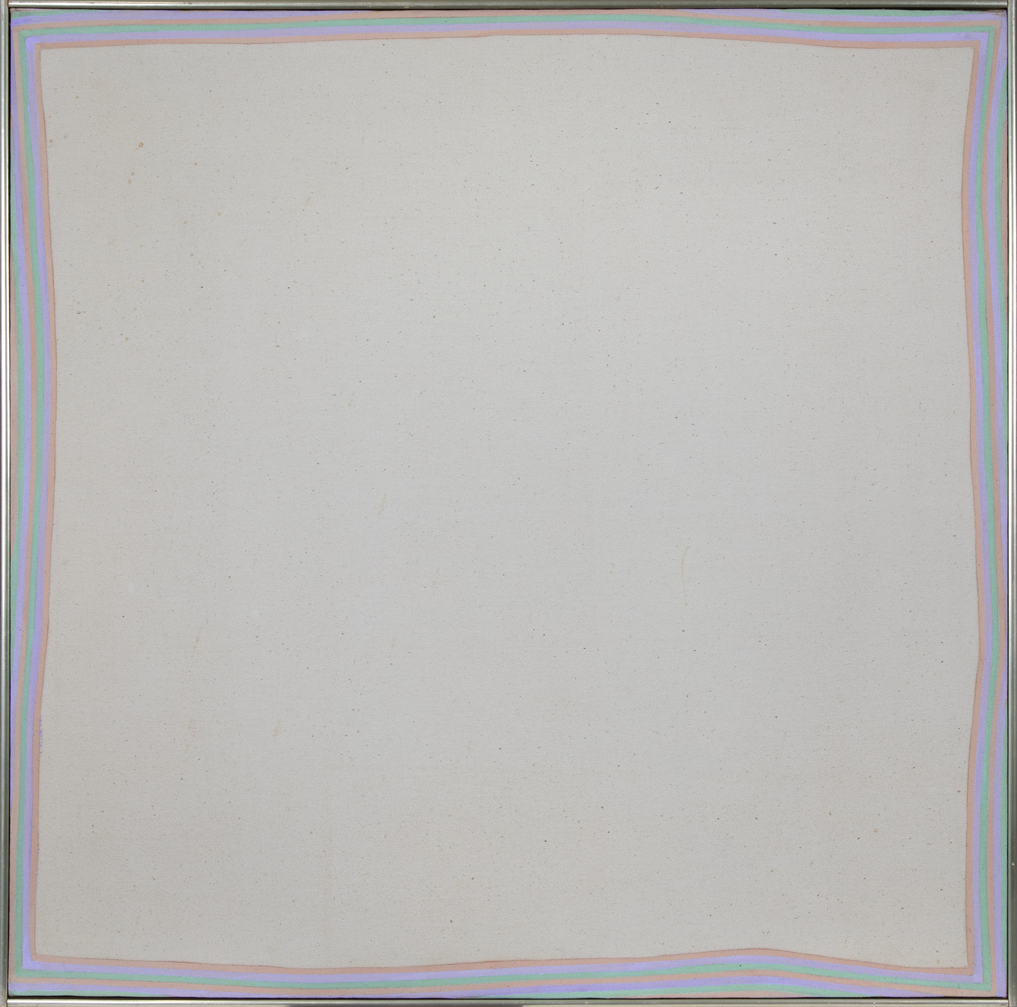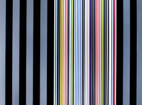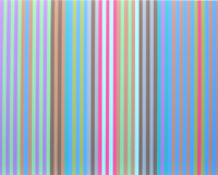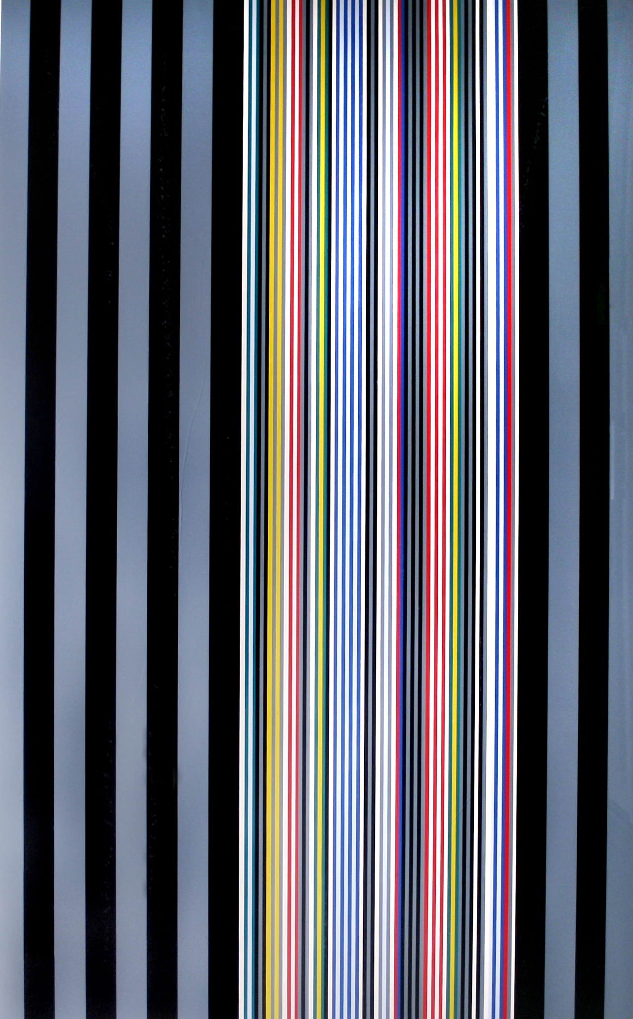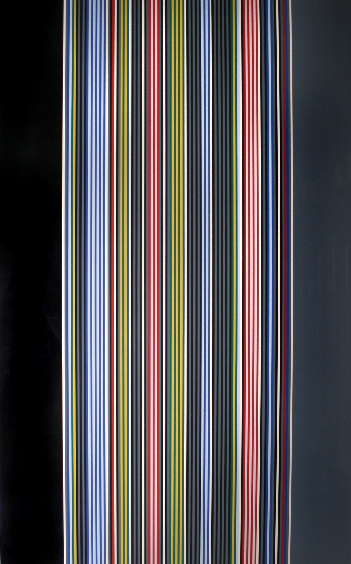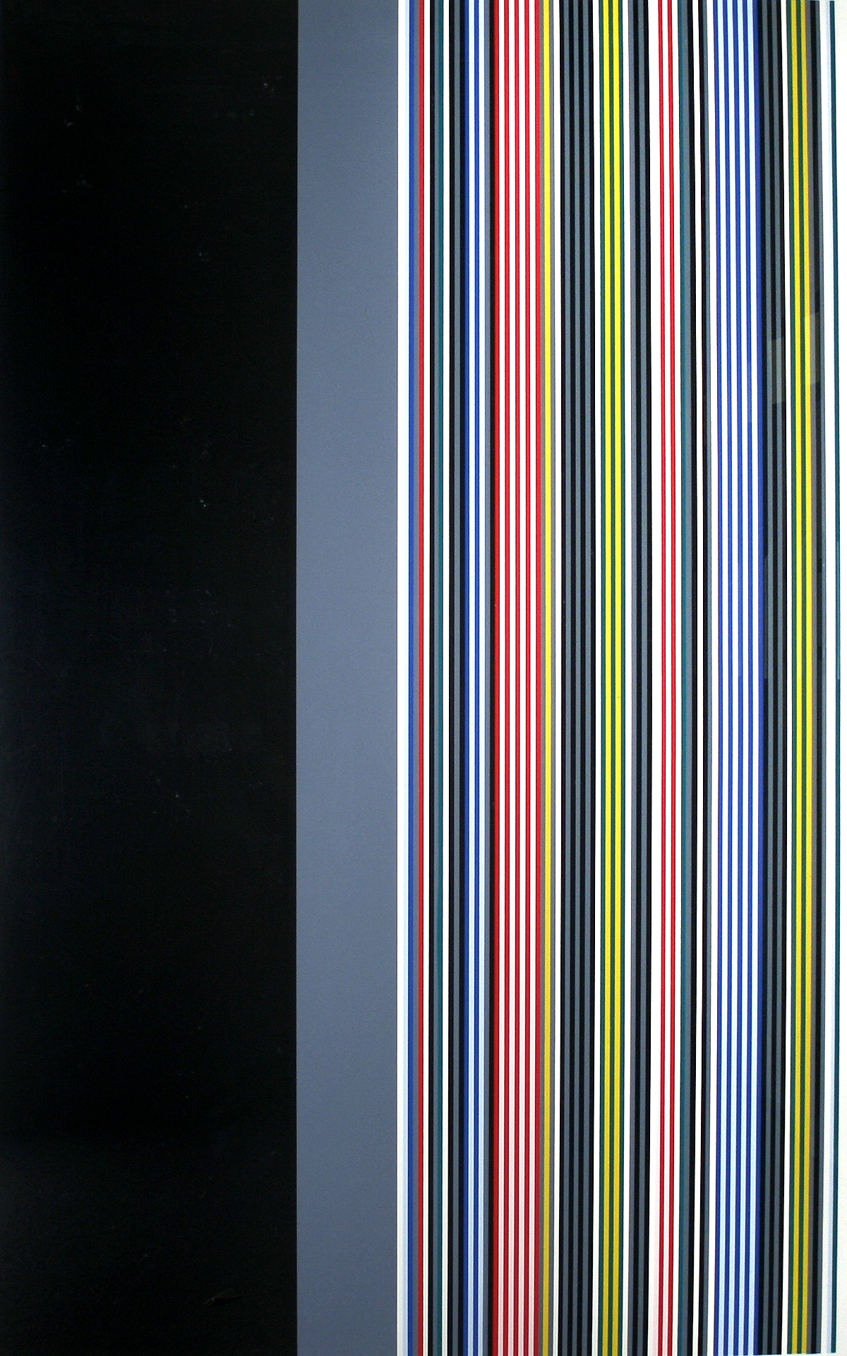 Self-taught abstract painter Gene Davis was celebrated for his lively compositions of thin, multicolored vertical stripes. Davis also specialized in collage, silhouette self-portraits, and other conceptual pieces. He utilized an observational, musical approach when painting, comparing his “playing by eye” to a jazz musician who plays by ear.