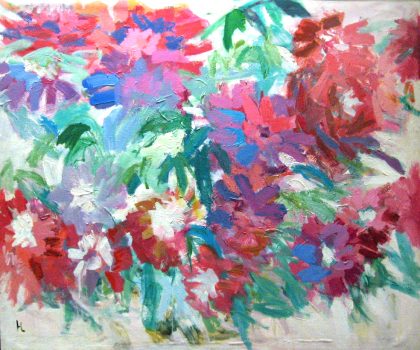 Helen Grigware Lambert’s early paintings were figurative and rendered in a dark palette, but by 1970, her style had become increasingly abstract, with lively colors and passages of white. Thin, delicate lines of dripped paint spread and interlace about the canvas, defining the flowers that had become her subject of choice and that her titles reference. In addition to being an artist, Lambert was also a lawyer and the first woman to graduate from the Gonzaga University School of Law in Spokane, Washington, in 1937. Lambert traveled around the world extensively during her law career, including to Japan, the former Soviet Union, and Israel; those countries left an indelible impression on her artistic vision.
