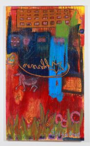 “My recent artworks reflect critically on the way mass media is used to convey social agenda. Among other concerns some of the paintings manifest judgmental, censorious ways of life and the many oxymoronic extensions in our so-called union. Visually, these paintings explore the relationships between the abstraction and the representational with an easily recognizable urban prospective. Using acrylic paint, oil stick, collage, sand, cement, and blends of mixed media, usually starting with an abstract field of energy, followed by added elements such as drawn images culled from sketchbooks as well as from my imagination. The end result is loose narrative paintings using bold contrasts of deep, strong colors with a mixed word usage of reversed type as the principal process.