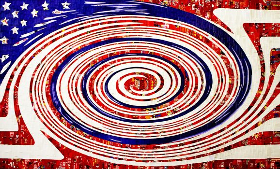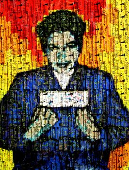 Kim Luttrell works with diverse materials, including paint chips scraped from her clothes, cut and reassembled cards, and other found objects. As she explains, “My work is both a blend of inspiration and compulsion. I find my ideas thrusting me further into a seemingly endless day. Those days become further filled with genuine excitement as I see my creations grow in complexity.”