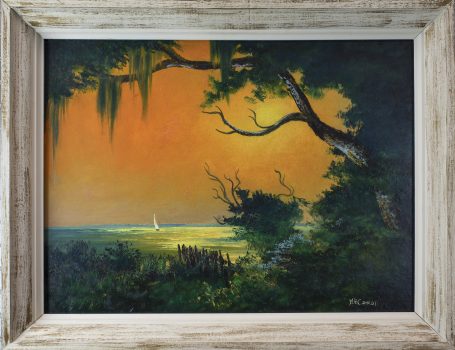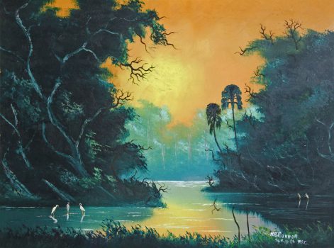 As the only female Highwaymen painter, Mary Ann Carroll faced social and economic hurdles on her journey to become a professional artist. Pragmatically recalling her struggle to support her family while developing her artistic career, she said, “I have never seen it as a man’s world or a woman’s world. What I saw was survival.” Like the other Florida Highwaymen, a group of African American artists celebrated for their distinctive paintings of Florida’s natural environment, Carroll sold her art from the trunk of her car, crossing the state in her Buick despite the potential for violence or discrimination. Of the Highwaymen, Carroll’s landscapes are noteworthy for their vibrant colors and crisp details.