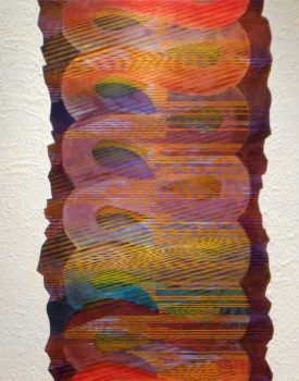 His Exit Music series reflects this investigation into such patterns and processes. By placing strips of blue painter’s tape on the canvas or panel, Beard creates cyclidic patterns that augment the dimension and movement of “roughly-hewn serpentine forms floating in an expressionistic soup.” Composed of shifting color fields with varying degrees of hue and temperature, these richly layered paintings explore the interaction between order and chance—what Beard has described as “the weaving of human will with natural forces as a creative activity that sculpts reality to our ever-changing needs and desires.”