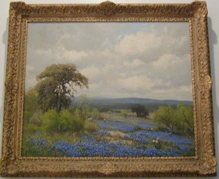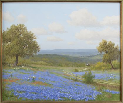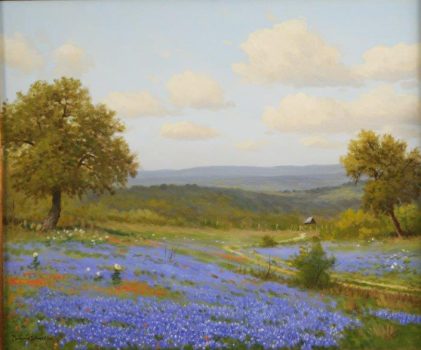 Porfirio Salinas was born in Bastrop, Texas. He lived most of his life in San Antonio, Texas where he died. Salinas attended the public schools of San Antonio for three years and was largely self taught as an artist. He learned from watching José Arpa, director of the San Antonio Art School, sketch in the streets and fields of San Antonio. He also learned from Robert Wood, a prolific landscape painter, who paid him five dollars a picture to paint in bluebonnets on his canvases because “he hated to paint bluebonnets.” Salinas was conscripted and served in the army from 1943, to 1945. He was assigned to Fort Sam Houston in San Antonio, where he painted murals for the officers’ lounge and other special assignments for Colonel Telesphor Gottchalk, reception center commander. He was allowed to live at home, where he continued his easel painting for the entire duration of his tour of duty. Although Salinas did not receive the attention of the professional art establishment (art galleries, museums, art critics, art historians) he achieved a popular following among many Texans as well as the political leaders of Texas and the United States – among them Lyndon Johnson who began to collect his work in the 1940s. The recognition of his work beyond the borders of Texas dates from Johnson’s presidency. This popularity allowed the artist to command high prices for his work. The city of Austin celebrated a Porfirio Salinas Day in 1973. The painter was honored for having “done much to bring the culture of Mexico and Texas closer together with his paintings.” Salinas dedicated himself to painting landscapes of Central Texas with particular attention to the bluebonnets that grow in abundance in the springtime.