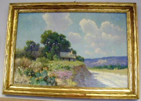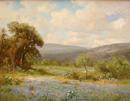 Like Texas painters Robert Onderdonk (1853-1917) and his son Julian Onderdonk (1882-1922), Robert Wood concentrated on the distinctive Texas landscape with its Red Oak trees and wildflowers that covered the hill country landscape. He developed a reputation for his scenes of Blue Bluebonnets, the state flower. In the spring, the Texas prairie is covered with wildflowers, especially in the hill country surrounding San Antonio and Austin. Wood incorporated native stone barns and rough wood farmhouses that added authenticity and romance to his compositions.