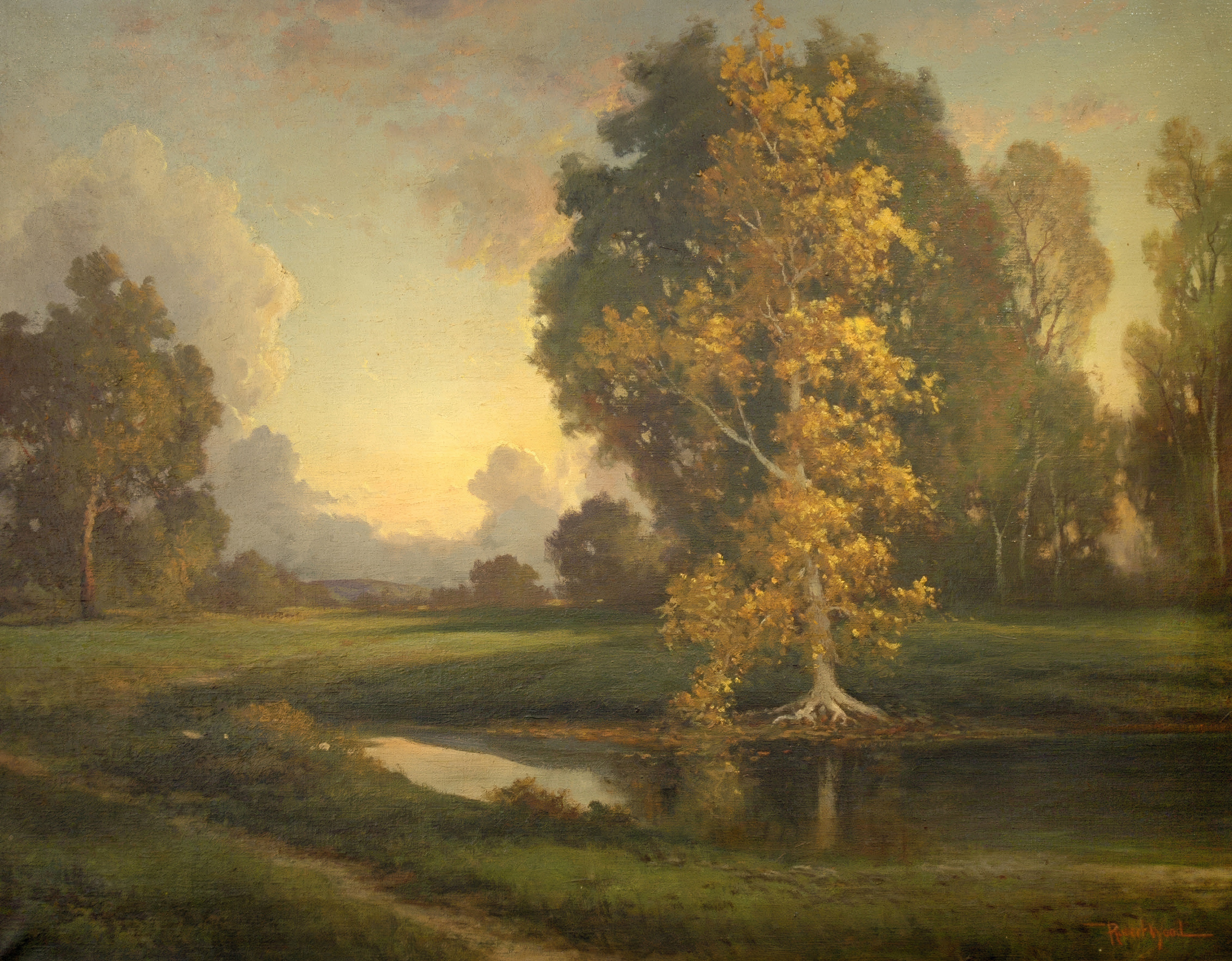 The public was captivated with Roberts Wood’s seasonal Woodstock paintings. He began working with an inexpensive print publishing house (possibly Donald Art Publishing Co.) to reproduce several of his paintings. The reproductions were an immediate success. October Morn, which was his most successful prints, sold more than one million copies in less than two years. These inexpensive paper reproductions made Robert Wood one of American’s most famous landscape painters.