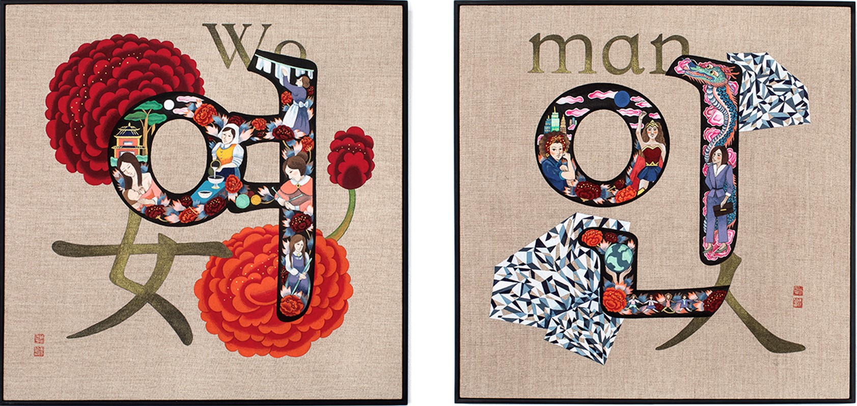 Stephanie S. Lee’s art references minhwa, Korean folk art from the eighteenth and nineteenth centuries. “I have always been fond of the bright colors and positive energy of minwha and been impressed by the fact that these paintings were created and shared over the course of many wars. Despite the hardships they were facing, the people of Korea kept a positive attitude and continued seeking hope and happiness through art,” she says. Reinterpreting this art form with a modern twist, Lee places contemporary objects in a traditional Korean setting, depicting the “everlasting human desire to pursue happiness that transcends its appearance, time, and era.”