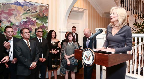 Jill Biden hosted the event held in late October to celebrate the collaboration between the U.S. Department of State’s Office of Art in Embassies and the Institute of American Indian Arts, as well as artists Tony Abeyta, Jeff Kahm, Courtney Leonard, Dan Namingha and Crystal World.
