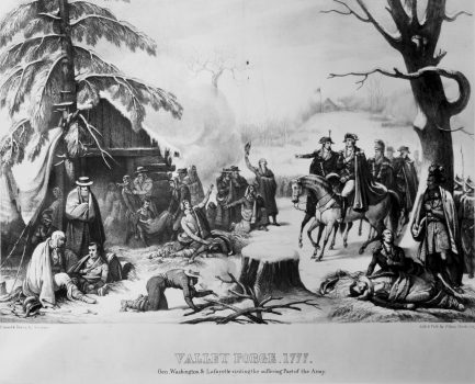 Antoine Placide Gibert specialized in genre painting and portraiture. Published as a print by American lithographer Philip Haas, Valley Forge, 1777 was potentially painted and drawn by Gibert. “Gen. Washington & Lafayette visiting the suffering Part of the Army” is printed underneath the title, and this lithograph shows just that: General George Washington and the Marquis de Lafayette visiting an encampment of American soldiers in Valley Forge, Pennsylvania, during the American Revolutionary War. The army lacked sufficient food and supplies at this point, and soldiers constructed log cabins and devised makeshift clothing and gear while waiting for provisions.