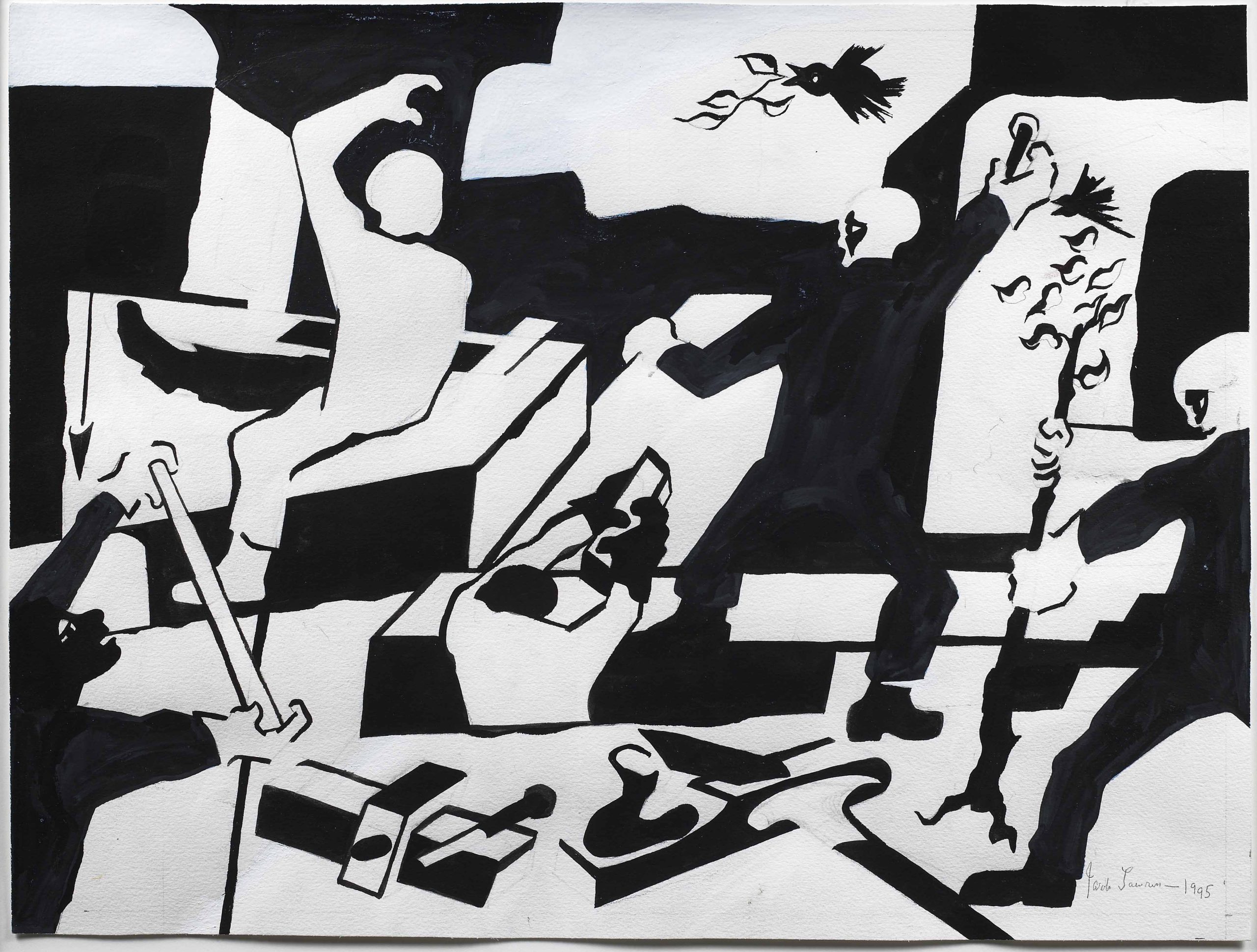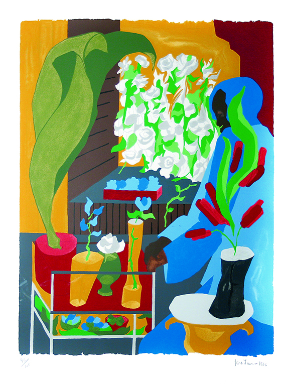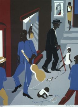 Jacob Lawrence was renowned for his bold, graphic paintings that depicted African American historical figures and the daily successes and struggles of the Black Americans he saw around him, specifically those part of the Great Migration from the rural south to Northeastern and Midwestern cities. Lawrence painted his diverse subjects in a pseudo-representational style with bright yet incongruous colors in flat, fragmented forms and space. “My pictures express my life and experience. I paint the things I know about and the things I have experienced,” Lawrence said.