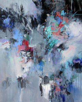 Kristin Herzog’s acrylic paintings move between nonrepresentational imagery and abstraction, often drawing on the rhythms of landscape and vegetation, as seen in Garden Palooza I and Early Rain I. Of Garden Palooza I, Herzog states: “living in Florida, I’m surrounded by all kinds of interesting vegetation which all grows very fast. This painting is a celebration of nature’s amazing creative powers.” Of Early Rain I, she has described “a grey, drizzly morning, mixing some fog in with the early light… a peaceful, quiet time as the rain mutes other sounds.”