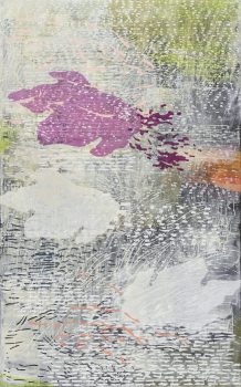 She allows for a natural, intuitive progression in her work. While drawing upon the established vocabulary of her rubber-stamped marks, she begins each painting without a preconceived notion of any final resolution, alternately concealing and revealing various elements through successive layers of acrylic paint and rice paper. The array of marks she has developed within the past few years provides a formal continuity throughout her body of work.