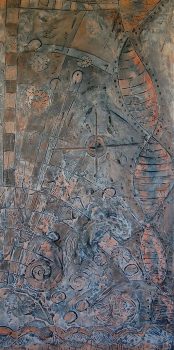Raised along the banks of the Coosa River in Alabama, P. Hope Brannon grew up wading in the creek during the summer seasons, observing rocks, leaves, moss, and small animals. Internal Compass is from her Fossils of Time series, which recontextualizes the idea of place, land, artifacts, and human history. Described as “an evolutionary process and an experimental exploration of contemporary drawing through painting, color, and line,” the series draws on historical research and fossilized life forms, connecting them to contemporary culture and innovations. Composed of plaster, spackling compound, graphite, and layered paints and waxes, the surface of this abstract bas-relief recalls ancient petroglyphs and pictographs.