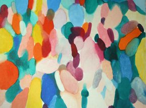Pat Steir is best known for her splashed, dripped, and poured waterfall paintings. Similar in technique to Jackson Pollock, Steir experiments with pouring and flinging layers of thinned paint onto an unstretched canvas as a way of “releasing herself from conscious consideration of imagery and composition and allowing the indexical trace of her process to become the image itself.”